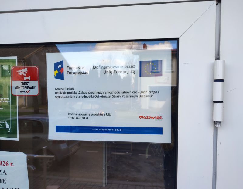 Gmina Bieżuń uzyskała dofinansowanie w wysokości 1 266 891,01 zł ze środków Unii Europejskiej na realizację projektu pn. „Zakup średniego samochodu ratowniczo – gaśniczego z wyposażeniem dla jednostki Ochotniczej Straży Pożarnej w Bieżuniu” współfinansowanego z Europejskiego Funduszu Rozwoju Regionalnego w ramach Priorytetu II „Fundusze Europejskie na zielony rozwój Mazowsza”, Działanie 2.4. Dostosowanie do zmian klimatu, programu Fundusze Europejskie dla Mazowsza 2021-2027.