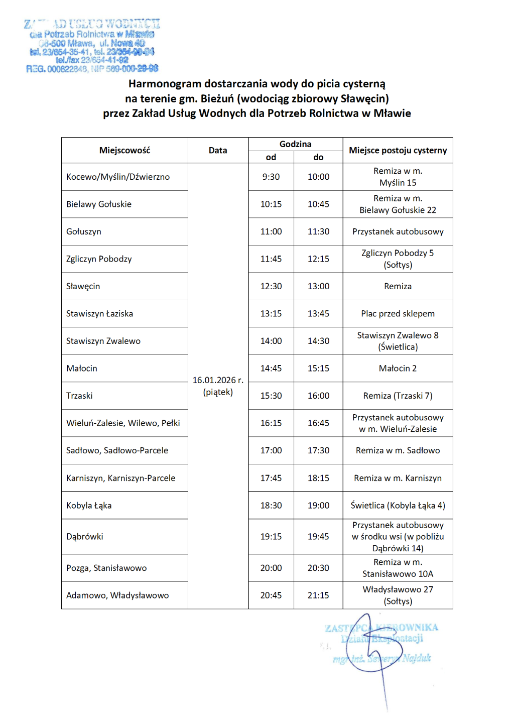 Harmonogram dostarczania wody do picia cysterną na terenie gm. Bieżuń (wodociąg zbiorowy Sławęcin) przez Zakład Usług Wodnych dla Potrzeb Rolnictwa w Mławie w dniu 16 stycznia 2026 roku
